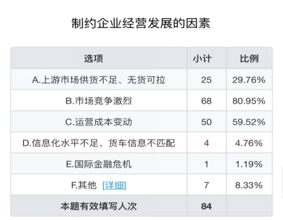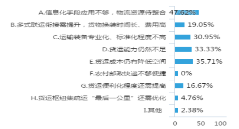 通过调查问卷显示,84户受调查的企业中有47.62%的企业认为当前货运物流存在的最大问题是信息化手段应用不够,物流资源待整合。