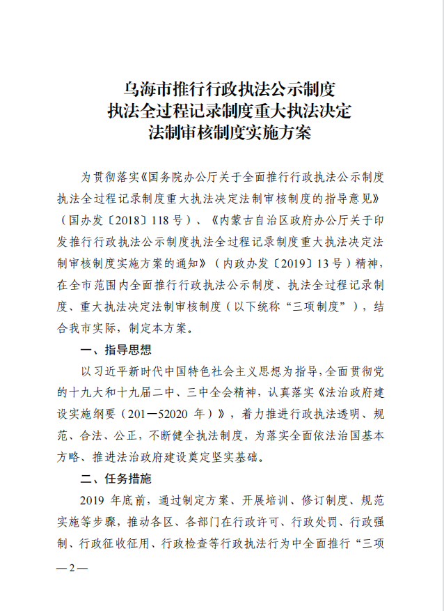 | 标 题 | 乌海市人民政府办公室 关于印发《乌海市推行行政执法公示制度执 法全过程记录制度重大执法决定法制审核制度 实施方案》的通知 | ||||||||