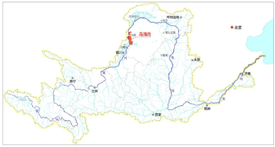 乌海市位于内蒙古自治区西南部,东倚桌子山,与鄂尔多斯高原毗邻,西靠贺兰山,与阿拉善草原接壤,南与“塞上江南”宁夏平原相邻,北与内蒙古河套平原相望。地处乌兰布和沙漠、库布其沙漠、毛乌素沙地交汇处,由北向南延伸,呈椭圆形,南北长约80km,东西宽约30km,总面积约1754km2。地理坐标为东经106º36′—107º05′,北纬39º15′—39º52′,平均海拔1150m。乌海市以黄河为轴,河东为海勃湾区、海南区,河西为乌达区,海勃湾区为市政府所在地。乌海市在黄河流域所处地理位置见图 2.1—1。