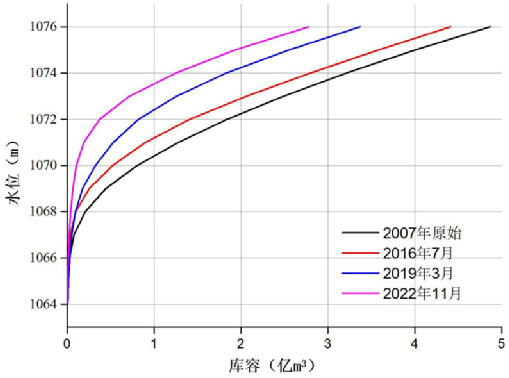 2013年8月海勃湾水利枢纽下闸蓄水运用,原始库容4.87亿m3。水流进入库区后,所挟带泥沙由于流速减小而沉积下来,到达库中后多沉积下来,造成水库回水末端处泥沙严重淤积,在大坝上游形成多处大面积河心滩,距坝10km—15km范围内大部分滩地淤积高程已超过1074.5m。截至2022年11月份,黄河海勃湾水利枢纽库区在1076m水位下的库容为2.78亿m3,比原始库容减少2.09亿m3,原始库容累计淤损43.0%。经预测,水库运用20年后基本达到泥沙冲淤平衡状态,正常蓄水位下库容为0.957亿m3(较原始库容减少80.4%)。海勃湾库区坝前6.76km至15.04km泥沙淤积量累计1.21亿m³,占总淤积量的80.8%。冬季防凌运用水位降低至1074.5m时,滩地出露面积显著增加。