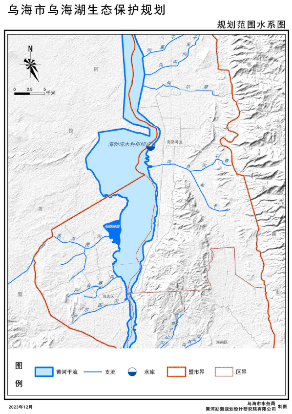 乌海市地表水资源主要来自黄河干流,其他山洪沟大多为季节性沟谷河流,流域面积狭小,水源涵养条件差。受地理和气候条件影响,大部分只在夏季降雨时有水,其余时候呈现断流状态。综合考虑乌海市的地形地貌、水资源开发利用条件、行政区划分、工农业产业布局等因素,可划分为海勃湾区、乌达区、海南区3个水资源分区,与行政区划边界一致。
