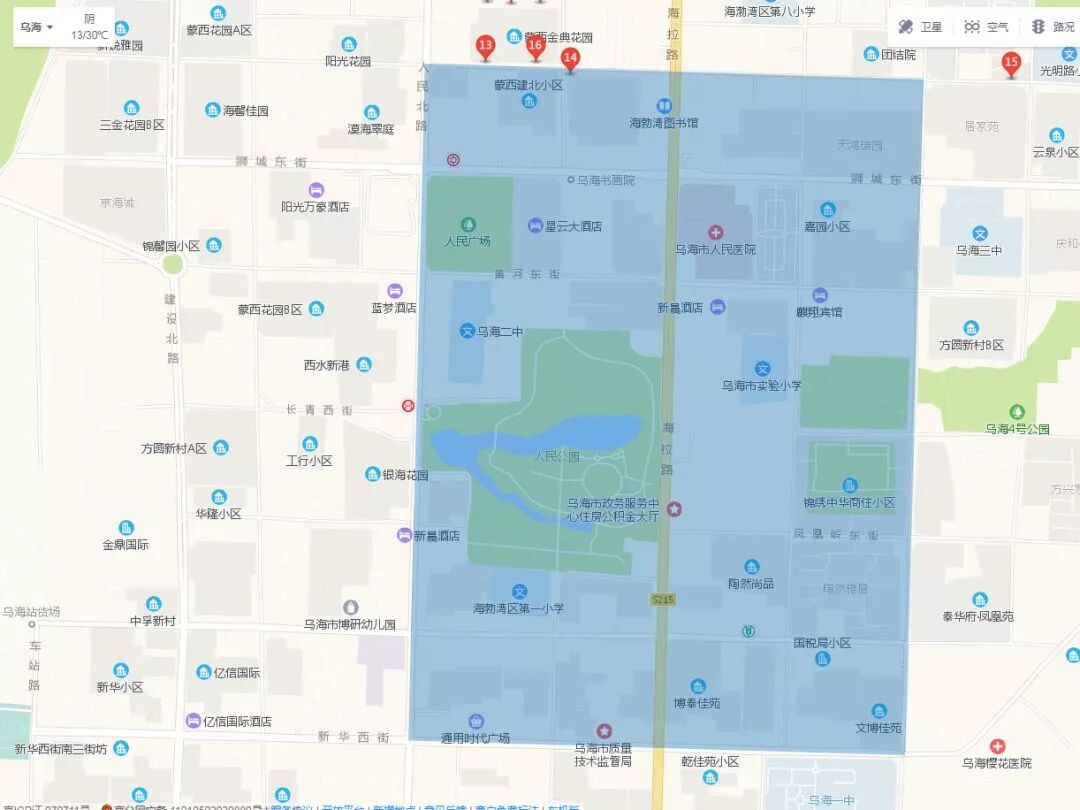 包括新华东街北二、三、四、五、六、七街坊,新华东街南一、二、三、四、五街坊,卓子山东街南一、二、三、四、五街坊,甘德尔东街南一、二、三、四、五街坊,体育大街一街坊,新桥大街一、二、三、四、五、六街坊,清泉大街一街坊,河槽东一、二、三街坊,新海大街,三厂区一、二、三街坊,海勃湾区六公里、十八公里以上户籍地址。