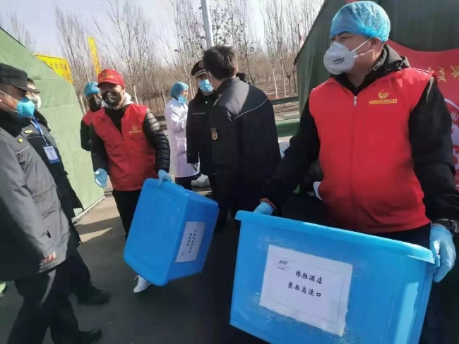2月6日中午12点刚过,满载着爱心快餐的送餐车就来到了蒙西高速口防疫监测站,为防疫一线工作人员送上了热腾腾的饭菜。这已经是巨海餐饮管理有限公司免费为防疫一线提供工作餐的第9天。