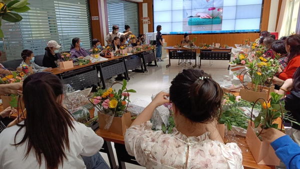 滨河社区居家养老服务站开展了“巾帼心向党 花香浸染间”主题插花活动。现场工作人员将鲜花、包装纸和专用剪刀等材料分发给到场的母亲们,在工作人员的指导下,大家迫不及待地动手插花,不一会儿,就完成了修剪、整枝,根据不同的色彩、形状精心搭配,满意地完成了独具特色的插花作品。