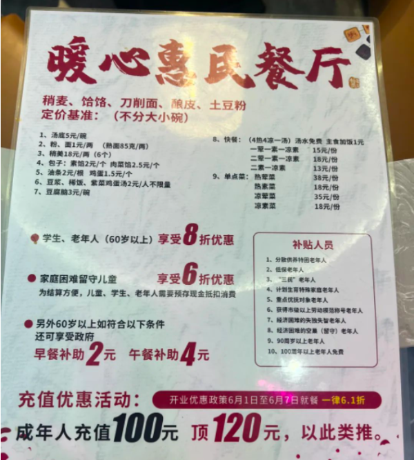 据了解,老年人(60岁以上)、学生就餐享受8折优惠,家庭困难留守儿童享受6折优惠,60岁以上符合补贴条件的老年人,还可享受政府早餐补助2元、午餐补助4元的优惠政策。