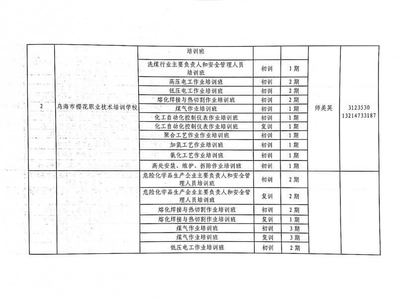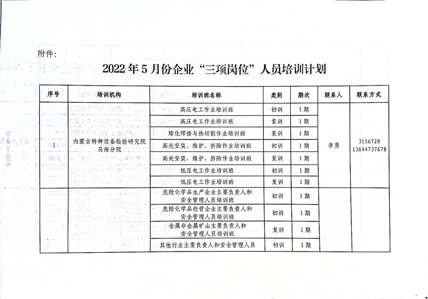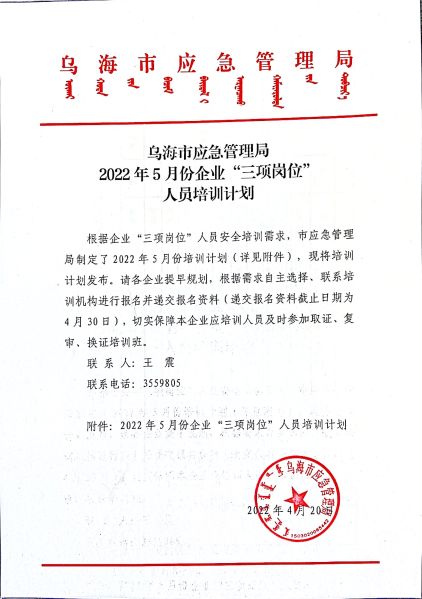 乌海市应急管理局2022年5月份企业“三项岗位”人员培训计划